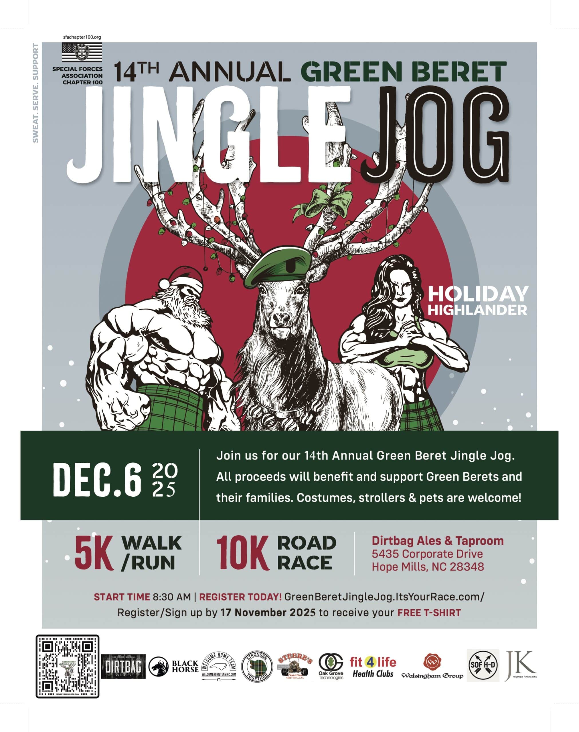 Join us for our 14th Annual Green Beret Jingle Jog. All proceeds will benefit and support Green Berets and their families. Costumes, strollers & pets are welcome!